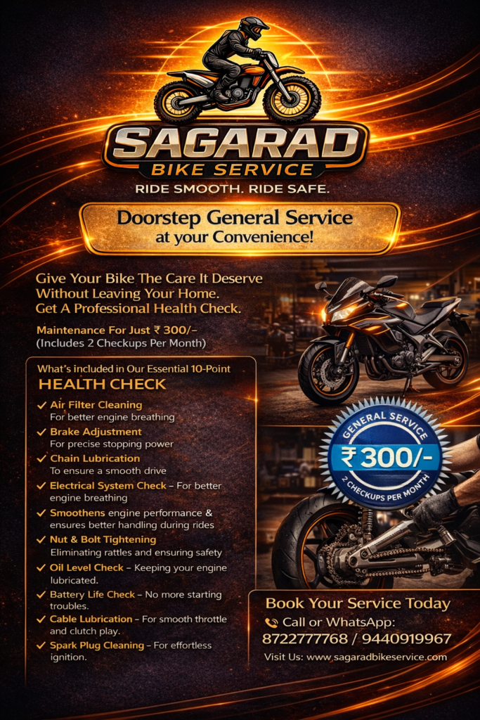 Sagarad Bike Service is a trusted two-wheeler service and accessories center based in Ameerpet, Hyderabad, delivering reliable and high-quality solutions since 2021.
